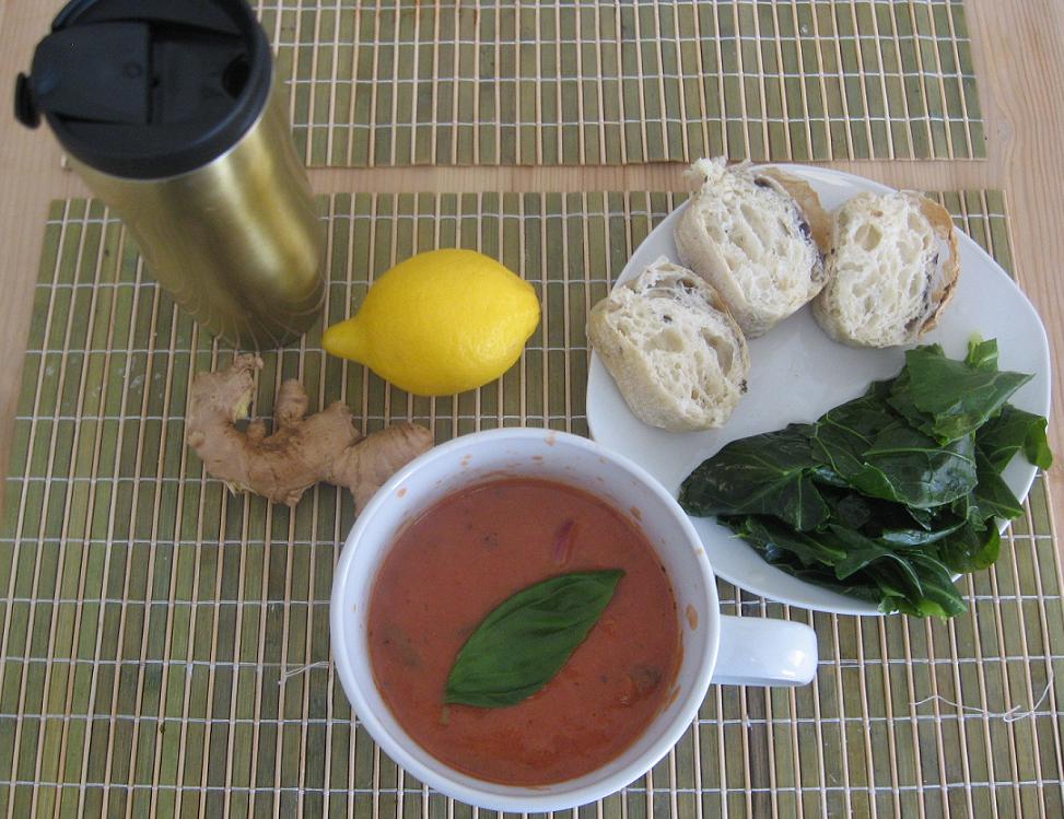 I had this today with a mug of ginger and lemon water, 1 cup of steamed green collards and a few pieces of olive bread – very tasty and easy to digest.