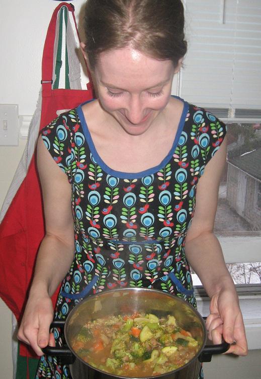 Plus today was sunny. Sunny means busting out the walking dresses, like this little number above (thank you, Freshly Baked Goods!). Sunny also means heaps of vegetables and fun walks to the grocery store to get said vegetables (walks that do not include battling windchill or wearing twelve pairs of mittens). And vegetables mean goulash, or at least they did today.