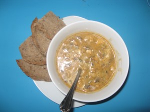 Back on track today though. I dragged Fialonia out of bed at 8am and we made the trek to Herb & Spice. I’ve been craving Mexican for awhile but as avocados take time, I purchased one today and will have to wait until Monday for my Mexican recipe (a tortilla pie…I’m intrigued). For lunch today, I wanted something easy (unsurprisingly, I have an unbelievable amount of work to catch up on and just found out that I’ve been invited to present my thesis work at a conference in two weeks…hahaha. This should be more than a little interesting). Soup is the easiest thing in the world so I went with a recipe from La Dolce Vegan called ‘On Golden Pond Mushroom Soup’. With some adjustments, this recipe was delightful.