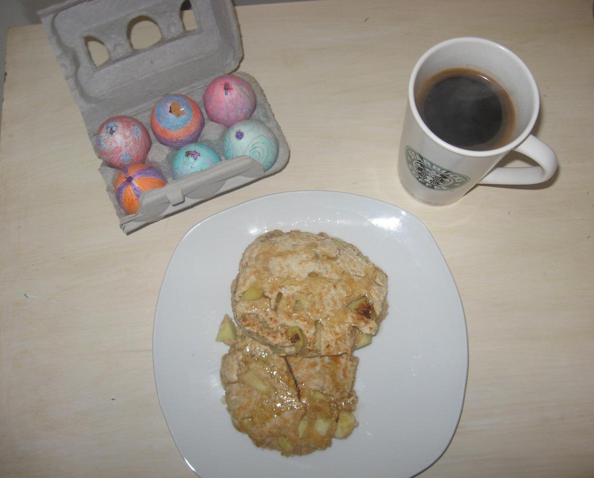 It’s Easter today. Which means nothing to me given that I’ve followed a strict diet of atheism for much of my adolescent and adult life. But Fialonia celebrates Easter so I made apple pancakes this morning to celebrate. They were more like fried apple muffins in the end, but we both still enjoyed them with heaps of maple syrup and (in my case) a big mug of hot coffee.