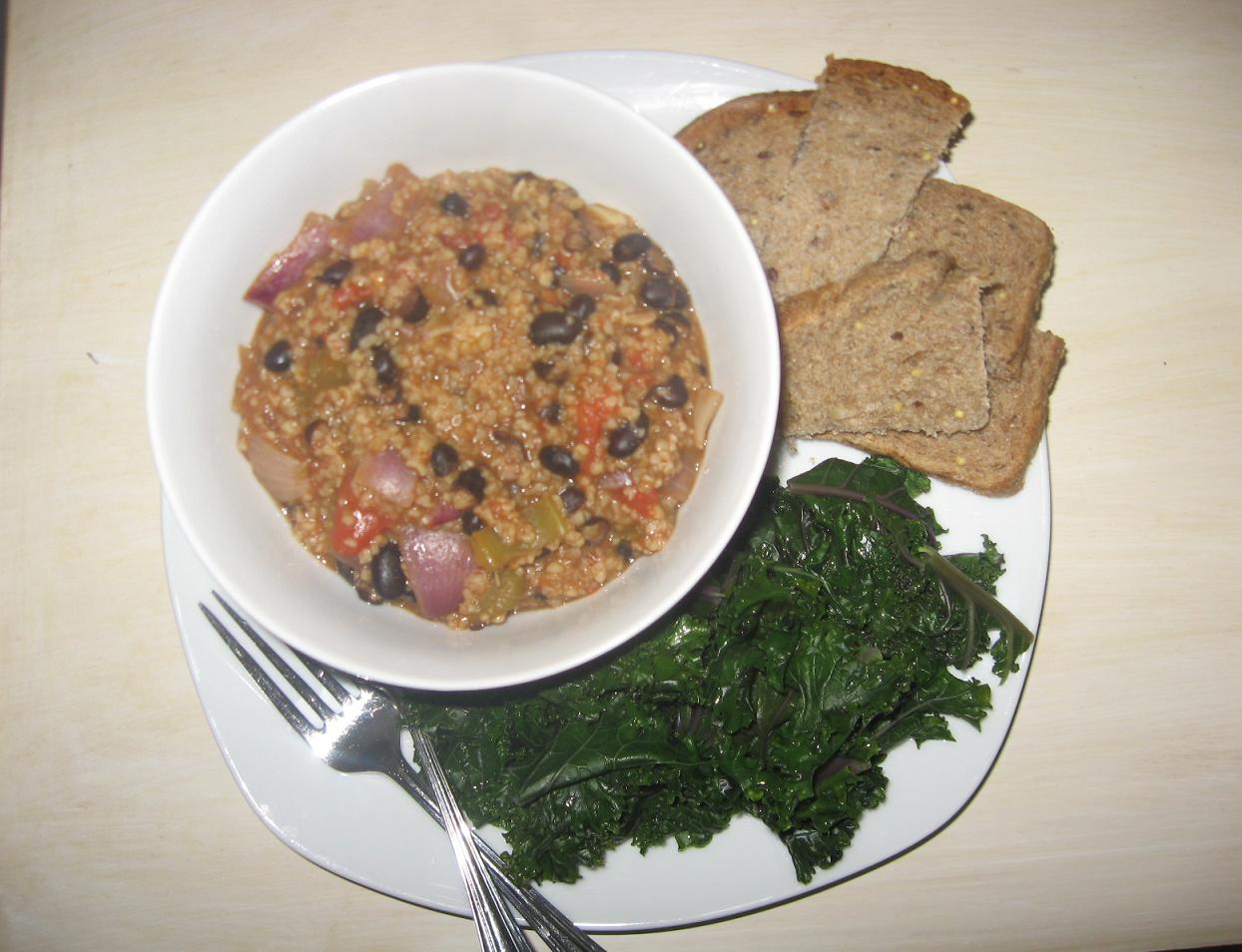 Chop up your onion, celery, and garlic and toss in a big pot with the olive oil. Saute until onions are translucent. Add your spices and tamari, then add the black beans and the tomatoes and mix it up. Add the vegetable stock and bulgur, mix and bring to boil. Turn down the heat to let simmer for 30 minutes. Done! This makes about four servings I’d say…five if you are having bread and vegetables (which you should be!) with it. I may or may not have enjoyed this stew with one of JW’s bottles of beer that was left in my fridge from A.’s going away party…