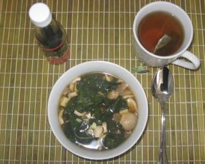 Now. Fialonia and I had plans of eating bread with this but, unbeknownsed to me, the bread was moldy. Boo-urns. Had I known this, I would have added some rice noodles or udon noodles to this soup. A cup of Zen tea (leftover from Fialonia’s starbucks days) had to suffice.
