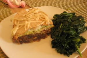Preheat oven at 350F. In a bowl, mash together the avocado, garlic, green onion, sour cream, and lemon juice until smooth. Set aside. In another bowl, mash together the black beans, salsa, chili powder and cumin. Set aside. Take a 8 inch pie plate (I use glass and never oil it but if you use a sticky one, lightly oil) and start layering!! First, lay down one tortilla. Top with half of the bean mixture. Then another tortilla. Then half of the avocado mixture with 1/2 cup cheese. Then another tortilla. Then the rest of the bean mixture. Then another tortilla. Then the rest of the avocado mixture and almost the rest of the cheese (save a little bit for the top). Finally, add the last tortilla and pop it in the oven for about 15 minutes. Take out and add the last of the cheese, then pop back in for another 5 or so minutes (until cheese is slightly melted and the top tortilla is getting a little crispy). Serve with a dollop of faux sour cream, a bit of salsa, and a side of something green (I went with leftover kale). Makes four servings of awesomeness.