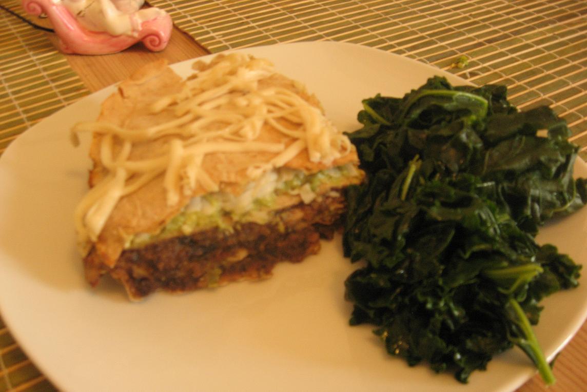 Preheat oven at 350F. In a bowl, mash together the avocado, garlic, green onion, sour cream, and lemon juice until smooth. Set aside. In another bowl, mash together the black beans, salsa, chili powder and cumin. Set aside. Take a 8 inch pie plate (I use glass and never oil it but if you use a sticky one, lightly oil) and start layering!! First, lay down one tortilla. Top with half of the bean mixture. Then another tortilla. Then half of the avocado mixture with 1/2 cup cheese. Then another tortilla. Then the rest of the bean mixture. Then another tortilla. Then the rest of the avocado mixture and almost the rest of the cheese (save a little bit for the top). Finally, add the last tortilla and pop it in the oven for about 15 minutes. Take out and add the last of the cheese, then pop back in for another 5 or so minutes (until cheese is slightly melted and the top tortilla is getting a little crispy). Serve with a dollop of faux sour cream, a bit of salsa, and a side of something green (I went with leftover kale). Makes four servings of awesomeness.