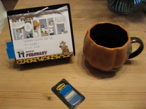 Enter the Get Fuzzy calendar that resides next to the phone and the bus tickets. This, along with some leftover Post-It tags that I did NOT steal from one of my office jobs, will become my new hard copy memory: