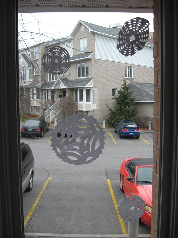 Right, so the thing is, when I decorated the house for xmas, I made snowflakes and put them on the windows. And in my infinite wisdom, I decided to use double-sided tape for this project. One would think that I’d have learned my lesson from the last time I used double-sided tape on a window (we still have the reminents of a poppy picture on our front door…[and when I went to write ‘poppy’, I almost wrote ‘poopy’ *chuckle*]). But clearly I forgot about the poppy picture problem because I went ahead and put no less than 24 snowflakes on our windows and left them there until today. Or maybe until forever because I can’t seem to get them off. Argh. I’ve been putting off dragging out the vinegar and nail polish remover and other household items that might help me, so today’s resolution is to stop putting this off, and take down the now yellowing and slightly tarnished looking snowflakes. Because Easter is coming up in a week and while I don’t celebrate Easter, there is something funny about having Jesus’s birthday decorations still up on his death day. I mean technically speaking he was born again during Easter so birthday decorations aren’t entirely inappropriate. No, no, no excuses, Ezmy. The snowflakes must come down.