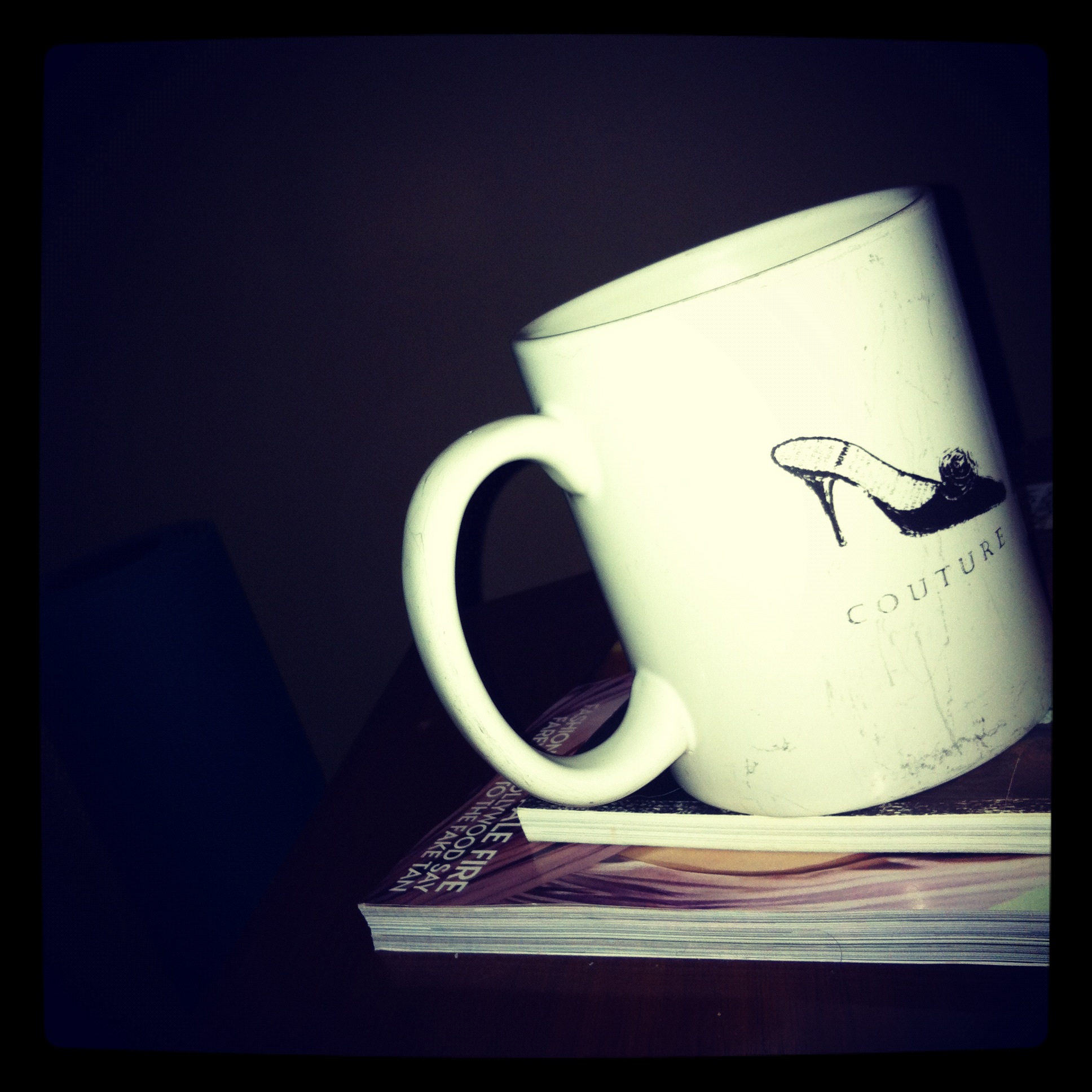 Right, so the mug was actually purchased that weekend. On the Saturday, I believe. Thursday was a wicked concert date with the gentleman and his friends, who were all awesome and super friendly (JE made me feel so at home, I didn’t want to leave). Friday was another great day (coffee, chatting, newspapers, long walks) and another night out with more awesome friends (RP and MC and EH and oh so many wonderful folks). By Saturday, I was saturated with feelings of awesomeness. These people were lovely, this man was lovely, this town was lovely. As we set out for another super fun adventure, I saw this coffee mug in the window of a drug store and thought “I love that mug. And you know what? I want it!” I told the gentleman I simply had to go inside, to which he replied, “Sure!” and happily joined me. No moaning about having to be somewhere or rolling his eyes over a silly whim. SO REFRESHING!